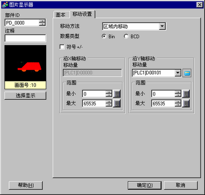 在图片显示器对话框中点击[移动设置]选项卡,并设置[移动方法]和[数据类型]。在[移动方法]中选择区域内移动,在[数据类型]中选择Bin。