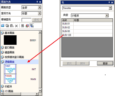 在[包]窗口中选择拟使用的子程序,将它拖放到[画面列表]窗口。