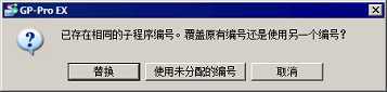 若[包]中选择的子程序与[画面列表]中注册的子程序同名,将弹出一个确认对话框,可选择覆盖现有子程序或用新名称注册子程序。但是,如果画面列表中已有32个子程序,则只能选择[覆盖]。