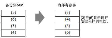 将指定的[写入触发位地址]置ON,保存在备份SRAM(或DRAM)中的采样数据会被写入内部寄存器。