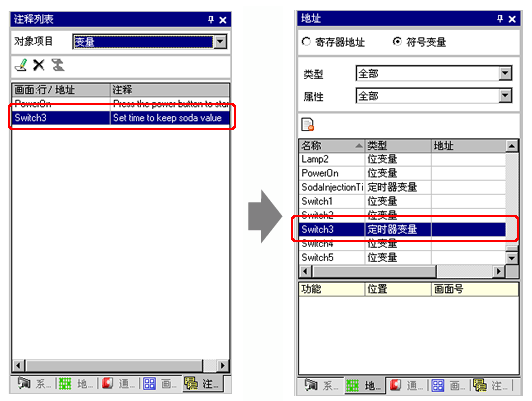 选择[地址设置]窗口的下半部分,在逻辑画面上选择目标变量。