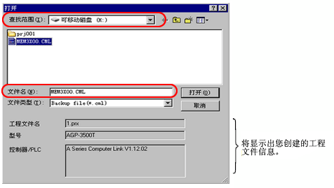 在下面的对话框中,在[查找范围]栏中选择CF卡。选择备份文件(*.cml)以将其转换为工程文件(*.prx),并点击[打开]。