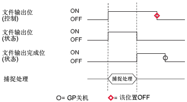 在文件输出完成位中,当捕捉处理完成时状态地址的位1置ON。在捕捉过程完成后,确认文件输出完成位为ON,然后从控制器/PLC中将文件输出位置为OFF。如果文件输出位置OFF,人机界面会将文件输出完成位置OFF。捕捉过程中的控制和状态时序如下