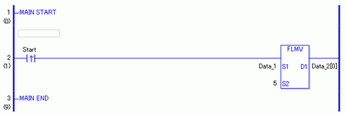 当上升沿指令置ON时,将执行FLMV指令。当执行 FLMV 指令时,将数据 1 复制到数据 2 的 0 至 4 号元素中。
