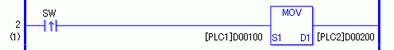 当触发写操作的位置ON时,会将[PLC1]D0100中的数据保存到[PLC2]D0200中。