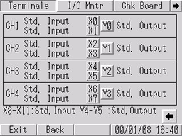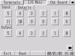 [I/O Monitor]画面打开。[Input]中相应的位编号会根据所连接设备输入的ON/OFF状态突出显示。 [Output]中: 您可以通过触摸相应的位编号,确认每项输出的开/关状态。