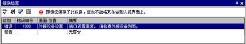 保存工程时会自动执行错误检查。如果工程文件中包含错误,将在[错误检查]窗口中显示具体内容。双击显示的行,有问题的画面将显示出来,此时请进行相应的修改。