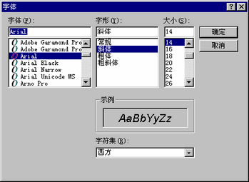 设置[字体(F)]、[字形(Y)]和[大小(S)],然后点击[确定]。例如:Arial,斜体,14。