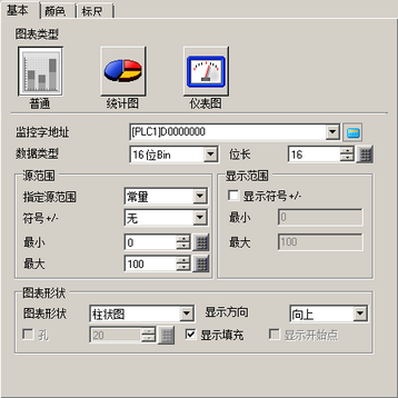 从[16位Bin]、[16位BCD]、[32位Bin]、[32位BCD]或[32位浮点]中选择图表显示数据类型。