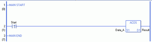 当上升沿指令置ON时,将执行ACOS指令。ACOS 指令计算 Data_A 的反余弦 并将结果保存在 D1 中。