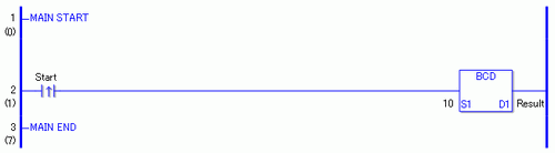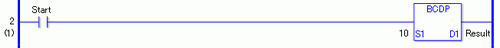 当上升沿指令置ON时,将执行BCD指令。当执行BCD指令时,10(二进制时是1010)被转换为二进制编码的十进制数0001 0000,并在D1中保存0001 0000。当使用常开指令时,只要常开指令变量保持为ON,就总是执行BCD指令。