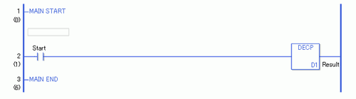 当常开指令置ON时,将执行DECP指令。当DECP指令执行时,将从D1(整型变量)中减去 1。