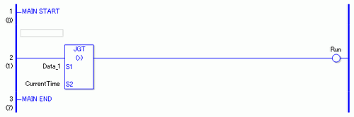 比较Data_1和CurrentTime,确定Data_1是否更大。如果结果是S1 > S2,那么该指令就接通,随即执行JGT指令右边的指令。在上图中,执行的是JGT指令右边的OUT指令。