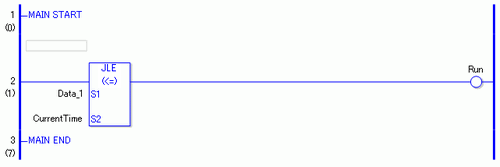 比较Data_1和CurrentTime,确定Data_1是否小于等于CurrentTime。如果结果是S1 <= S2,那么该指令就接通,随即执行JLE指令右边的指令。在上图中,执行的是JLE指令右边的OUT指令。