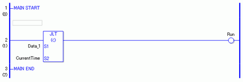 比较Data_1和CurrentTime,确定Data_1是否小于CurrentTime。如果结果是S1 < S2,那么该指令就接通,随即执行JLT指令右边的指令。在上图中,执行的是JLT指令右边的OUT指令。