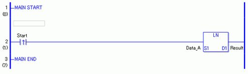 当上升沿指令置ON时,将执行LN指令。LN指令计算Data_A的自然对数并将结果保存在D1中。