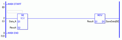比较Data_A和Result,确定Data_A是否不等于Result。如果NE指令的结果是S1 <> S2,那么NE就接通。然后执行NE指令右边的指令。在上图中,右边的指令是MOV指令。