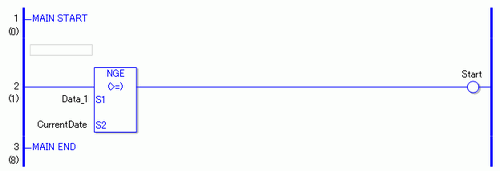 比较Data_1和CurrentDate,确定Data_1是否大于等于CurrentDate。如果结果是S1 >= S2,那么该指令就接通,随即执行NGE指令右边的指令。在上图中,执行的是NGE指令右边的OUT指令。