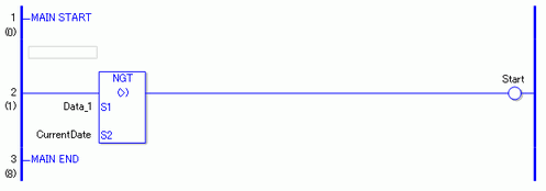 比较Data_1和CurrentDate,确定Data_1是否更大。如果结果是S1 > S2,那么该指令就接通,随即执行NGT指令右边的指令。在上图中,执行的是NGT指令右边的OUT指令。