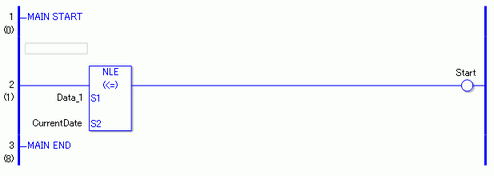 比较Data_1和CurrentDate,确定Data_1是否小于等于CurrentDate。如果结果是S1 <= S2,那么该指令就接通,随即执行NLE指令右边的指令。在上图中,执行的是NLE指令右边的OUT指令。