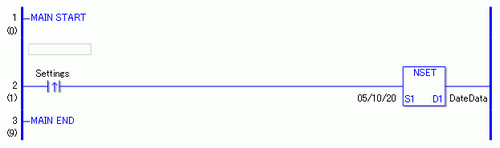 当上升沿指令置ON时,将执行NSET指令。当执行NSET指令时,将在D1的日期变量中保存对话框中指定的日期:10(月)20(日),2005。
