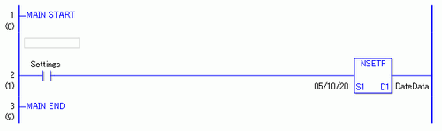 当常开指令置ON时,将执行NSETP指令。当执行NSETP指令时,将在D1的日期变量中保存对话框中指定的日期:10(月)20(日),2005。