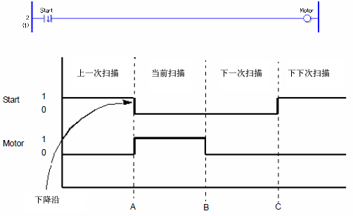 变量Motor保持OFF,因为未检测到变量Start的下降沿。