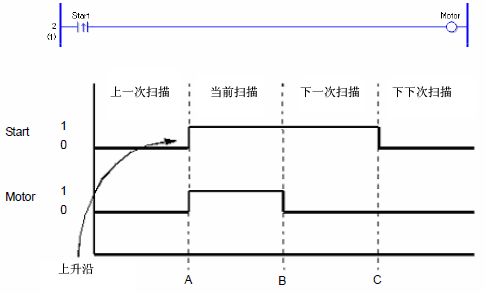 变量Motor保持OFF,因为未检测到变量Start的上升沿。