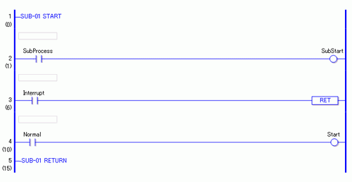 RET指令只能在子程序中使用。当跳转至子程序指令在主程序中执行时,程序流就转移到子程序。子程序处理第一行和第二行中的指令。如果第三行中的常开指令变量为ON,则执行RET指令,将程序流返回到主程序,而不执行第四行。