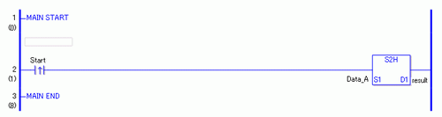 当上升沿指令置ON时,将执行S2H指令。当执行S2H指令时,会将Data_A的S2H转换结果保存在D1中。