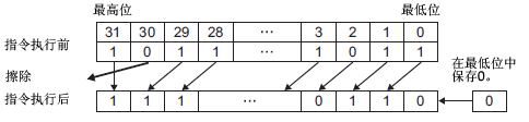 当执行SAL或SALP指令时,会将S1的各个位右移S2个位。每移动1位时,第30个位将丢失。将0保存在最底位的空位中。最后将结果保存到D1中。