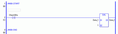 当上升沿指令的变量置ON时,将运行SAL指令。当执行SAL指令时,会将移位结果保存到D1中。最高位不发生移位,在最低位中保存0。