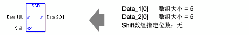 当执行SAR或SARP指令时,会将S1的各个位右移S2个位。每次移位时,最低位将丢失,最高位则被保存在最左边的空位中。最后将结果保存到D1中。SAR和SARP指令总是处于接通状态。使用SAR和SARP指令时,如果为操作数S1和D1指定的变量类型不同,就会发生错误。 请为操作数S1和D1指定相同的变量类型。