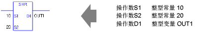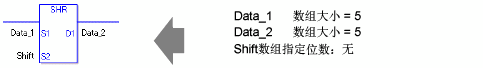 SHR和SHRP指令总是处于接通状态。使用SHR和SHRP指令时,如果为操作数S1和D1指定的变量类型不同,就会发生错误。 请为操作数S1和D1指定相同的变量类型。