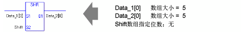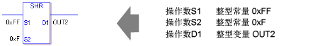 当执行SHR或SHRP指令时,会将S1的各个位右移S2个位。每移动一位时,最右侧的位(最低位)将丢失。在最高位的空位中保存0。最后将结果保存到D1中。