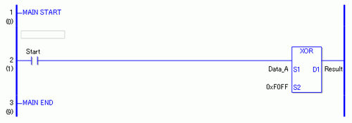 当常开指令置ON时,将执行XORP指令。当执行XORP指令时,将Data_A和F0FF执行逻辑异获得的结果保存在D1中。