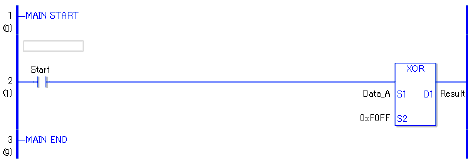 当上升沿指令置ON时,将执行XOR指令。当执行XOR指令时,,将Data_A和F0FF执行XOR获得的结果保存在 D1 中。