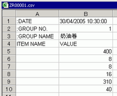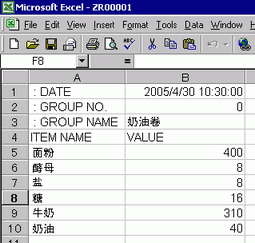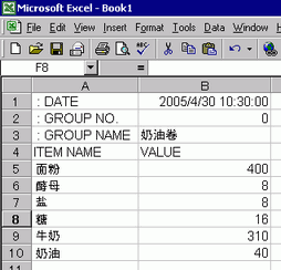 打开Microsoft Excel,在适当的位置输入“:DATE”、“:GROUP NO.”、“:GROUP NAME”、“ITEM NAME”和“VALUE”项目,并输入配方数据。