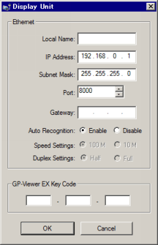 Adjust the settings for the Ethernet connection. This set up is required when communicating with a device/PLC over Ethernet and when using a network computer to transfer project files, run GP-Viewer, or run Pro-Server EX.