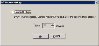 From the [Tool] menu, select [Off timer] to display the [Off Timer settings] dialog box. You can use the [Off Timer settings] dialog box to exit Camera-Viewer EX after a specified period of time.
