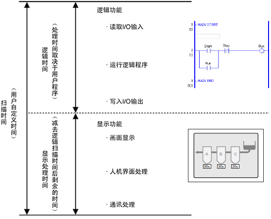逻辑时间包括逻辑功能和显示功能(画面显示、人机界面处理、通讯)。逻辑功能运行逻辑程序。