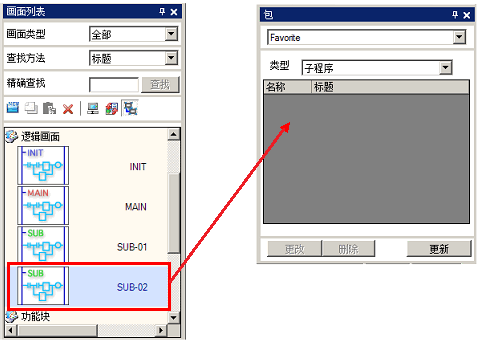 也可以将子程序从[包]拖放到逻辑画面,从而直接插入子程序。此时,子程序也被注册到[画面列表]窗口。