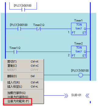 在逻辑画面中,选择拟注册为功能块的行,右击,从弹出菜单中选择[注册为功能块]。