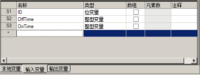 打开变量列表的[输入变量]选项卡,创建两个变量,用于接收ON和OFF持续时间。(例如:创建两个整型变量“OffTime”和“OnTime”。)