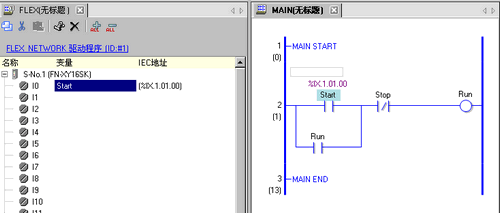 下面的例子是并列显示的逻辑(MAIN)和I/O(FLEX NETWORK)窗口