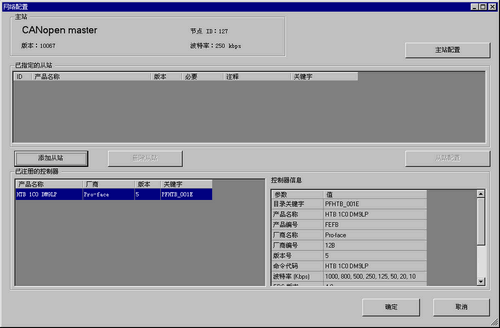 接下来,在CANopen网络中添加HTB(从站)。在[EDS列表]中,选择HTB的EDS文件并点击[添加从站]。