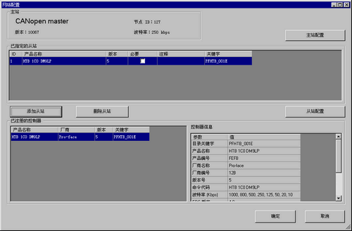 点击[主站配置],将显示如下对话框。配置所有CANopen网络设置,如波特率、全局同步周期和主站对象设置。点击[确定]启用设置,对话框关闭。