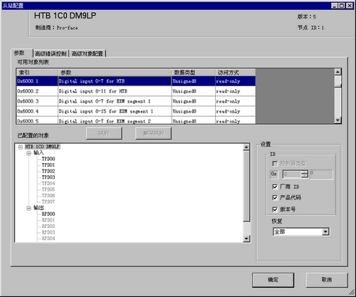 选中添加的从站模块,点击[从站配置],将显示如下对话框。根据需要使用的功能,配置通讯参数设置,并设置要使用的对象的操作和数值。点击[确定]启用设置,对话框关闭。