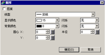 在指定点上画一个圆。当勾选了[图案]复选框时,会绘制一个实心圆。选择并输入直线类型(或在选择图案时选择实心图案)、颜色属性、中心坐标和半径值。可以间接设置中心坐标和半径。