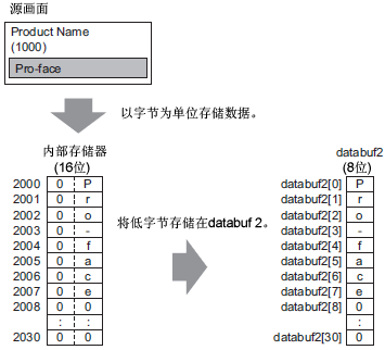 更改数据格式以便向打印机发送打印数据。将按顺序保存在内部寄存器地址1000中的数据(产品名称)分割为字节单位,作为字符串数据保存到内部寄存器地址2000~2030的低字节。
